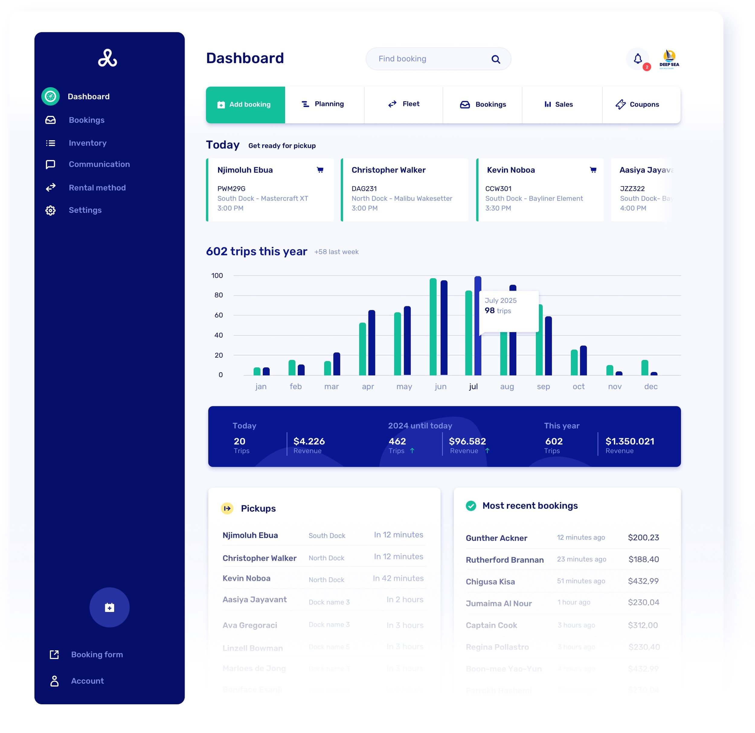 Our latest update includes improvements to the landing page and dashboard, offering a clearer view of upcoming and recent bookings. You'll also find useful data on trip frequency per year and month, along with a handy search function to quickly find what you need.